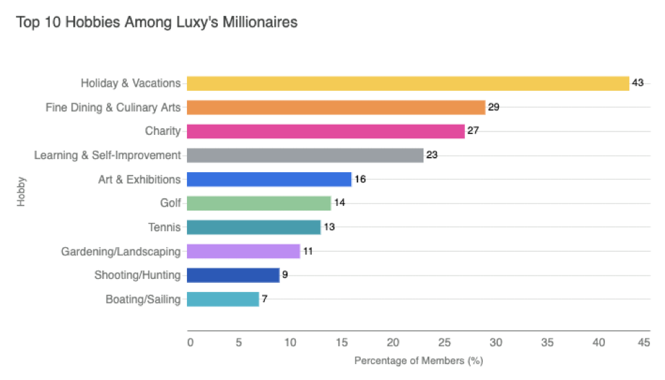 Our survey reveals a fascinating array of hobbies that capture the attention of Luxy's HNWI members. The data, allowing for multiple selections, provides a comprehensive view of their diverse interests.