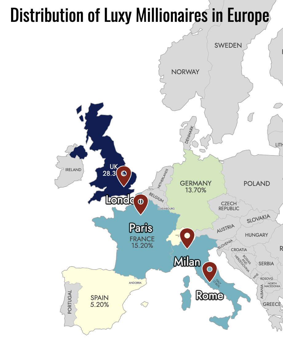 Germany (13.7%), Switzerland (8.6%), and Spain (5.2%) present a contrasting picture compared to the UK, Italy, and France. In these countries, HNWIs on Luxy are less concentrated in major metropolitan areas and more dispersed across smaller towns and regions.
