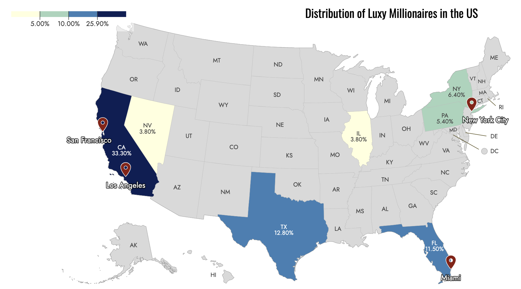 California comes first, attracting 33.3% of Luxy’s US-based HNWI respondents. This dominance is hardly surprising, given California's status as a global hub for technology, entertainment, and innovation. The state's diverse economy, coupled with its desirable climate and lifestyle, makes it an irresistible draw for those seeking both financial success and personal fulfillment.