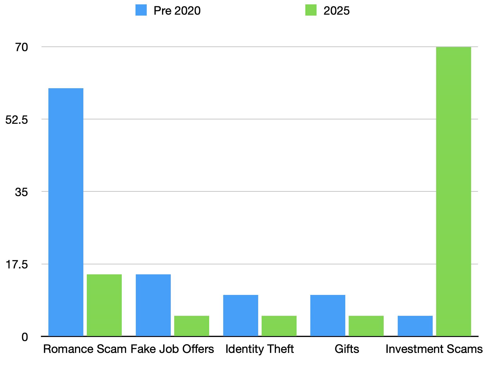 Scammers from these regions almost exclusively focus on highly sophisticated investment scams, commonly known as "pig butchering”. These are elaborate, long-term cons designed to build deep emotional trust before convincing victims to invest large sums in fake platforms. The "why" here is multi-faceted: these operations are often run by large, organized syndicates with significant resources, including technical infrastructure for creating fake trading platforms and training for psychological manipulation.