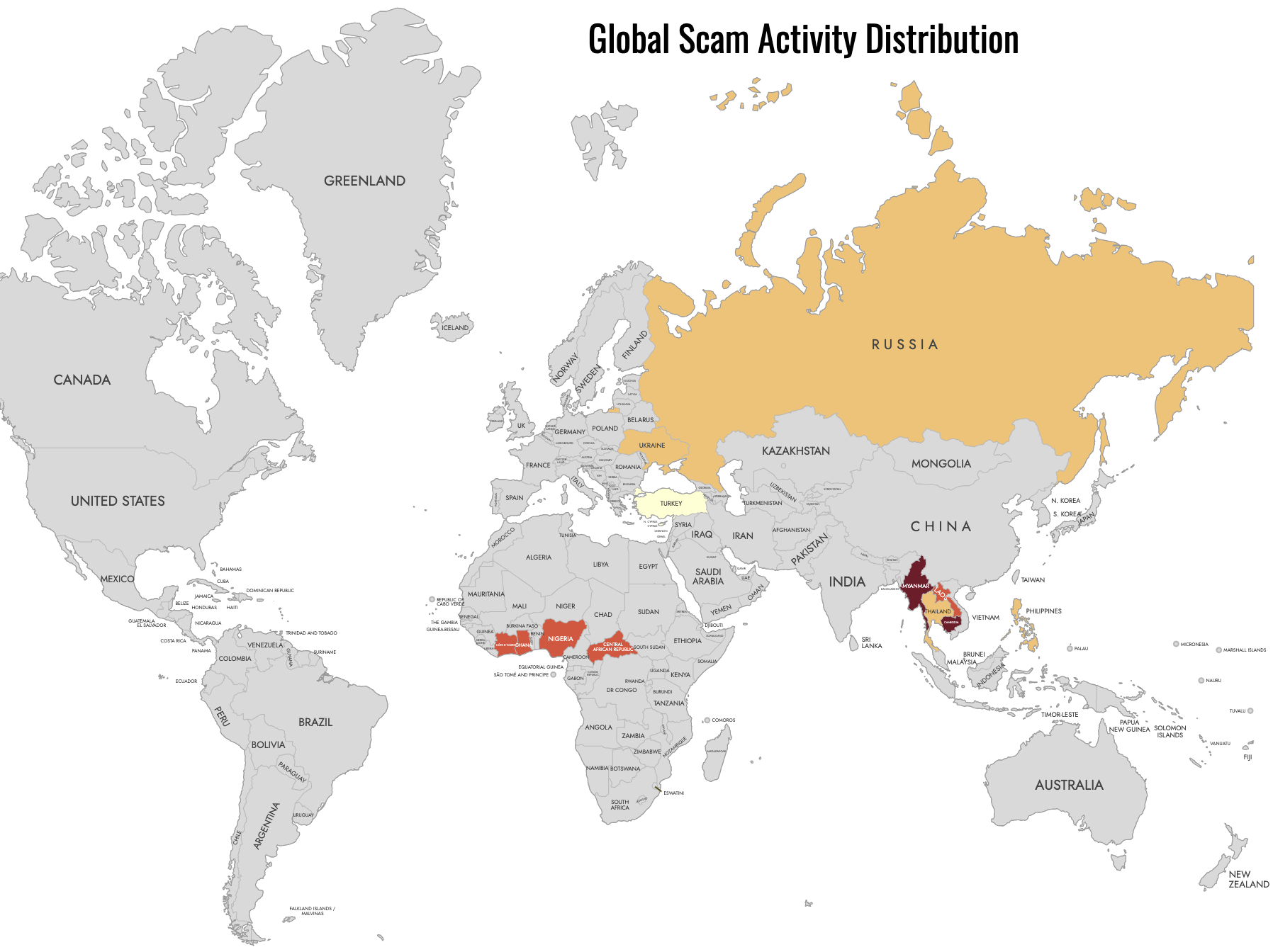 Thailand (5%) and Philippines (5%): While also present, these locations show less scam activities compared to their neighbors, mainly for being more stable. However, similar sophisticated operations originate from here. - Central Africa (roughly 10% of detected scams)
