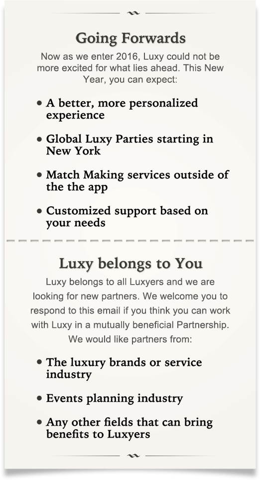 2015 has been a great year for Luxy. The Luxy community continues to grow and we have released many new features including my personal favorites: Moments and Rose. We could not have done this without you. So firstly, I would like to say thank you for your continued support.
